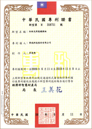 本公司自動防眩光照後鏡模組產品榮獲中華民國專利證書新型第M 358751 號之證書。